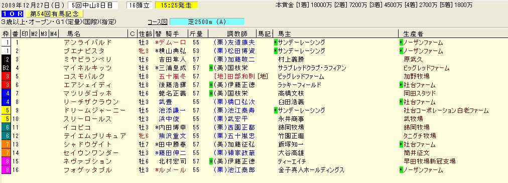 さて、有馬記念2009の出馬表(枠順)確定しました。