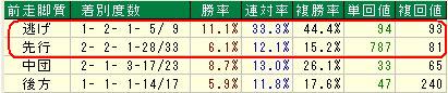 前走「逃げ、先行馬」が好成績です。